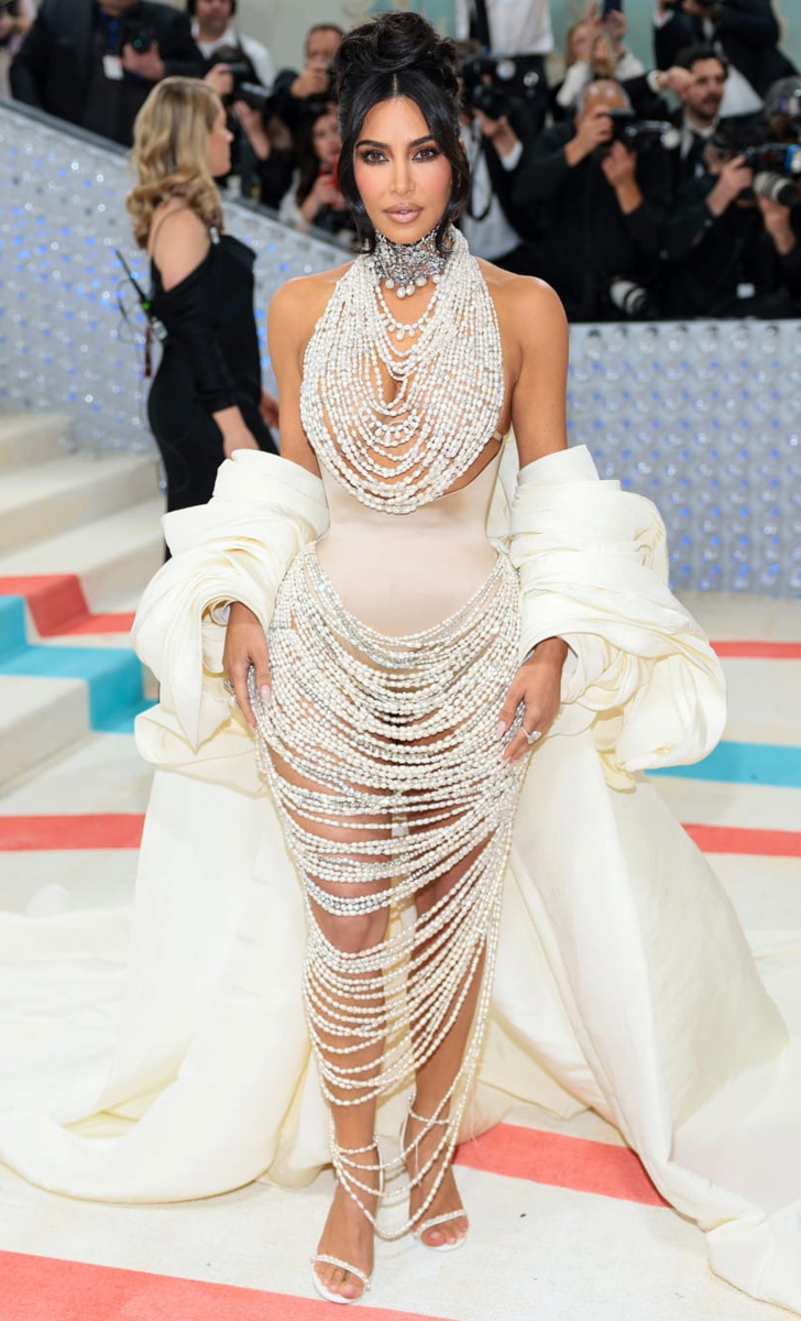 Kim Kardashian a ébloui les invités au Met Gala lorsqu’elle est arrivée au Metropolitan Museum of Art dans sa robe perlée sur mesure, créée par Schiaparelli. Sa tenue se compose en grande partie d’un corset transparent orné de longs colliers constitués d’un peu plus de 50 000 perles d’eau douce.