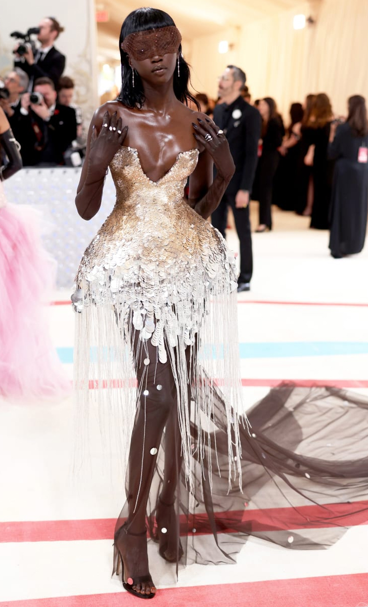 Depuis sa première Met Gala en 2019, Anok Yai a toujours su ce qui comptait. En 2023, elle a brillé dans une création de Prabal Gurung. Sa robe sans bretelles, ornée de paillettes dorées et argentées, était accompagnée d’une jupe de sirène qui semblait se dissoudre dans l’air de manière magique !