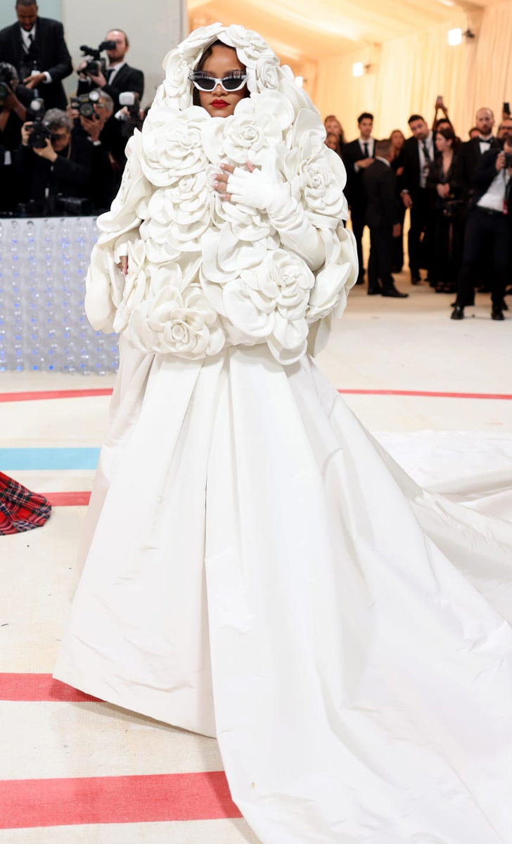 Rihanna est venue à la soirée annuelle de collecte de fonds du Met Gala en mai 2023 pour épater le public, ce qu’elle a fait avec sa tenue Valentino. A sa montée des marches, elle a retiré une sur-robe blanche avec des détails de roses pour révéler une robe sans manches qui souligne son ventre rond.