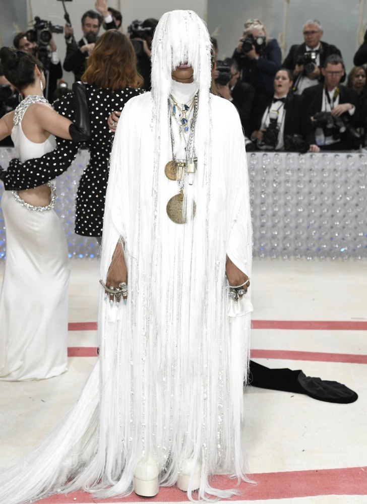 Erykah Badu a fait une déclaration aussi audacieuse et élégante à la mode en portant cet ensemble tout en blanc lors du Met Gala en 2023. Elle porte ici une création sur mesure de chez Marni, créé par Francesco Russo, qui comporte 90 000 mètres de fil, de perles et de cristaux cousus à la main.