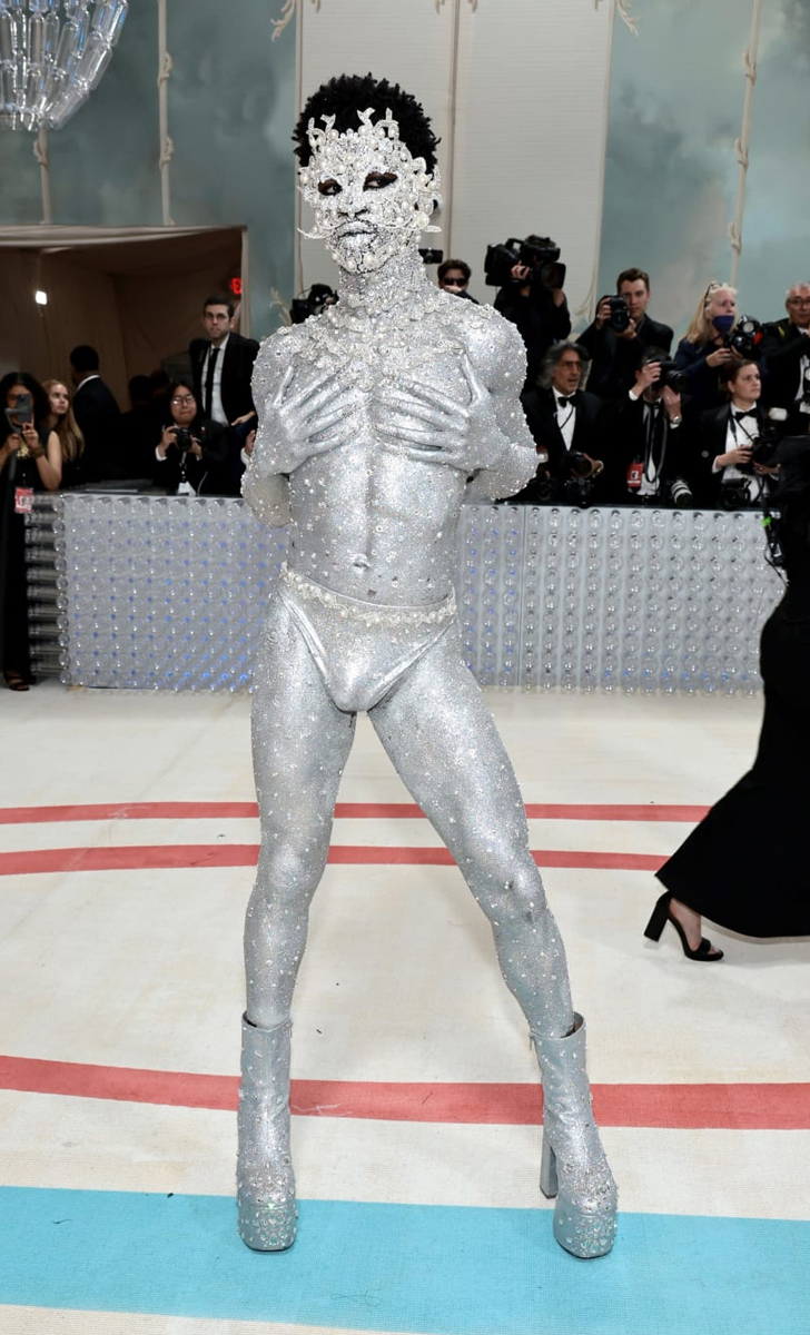Au Met Gala 2023, le rappeur Lil Nas X a suscité beaucoup d’applaudissements en se présentant dans un look sans égal pour cet événement. Il s’est plus spécialement dévoilé avec de la peinture argentée sur tout son corps, en plus d’être recouvert de 218 784 cristaux Swarovski et de perles blanches.