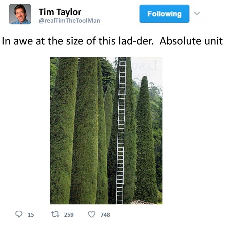 We’re not sure what is more surprising, the size of this ladder or the fact that Tim “The Toolman” Taylor has a Twitter account. The character was, of course, famously played by Tim Allen as the main character in the classic show Home Improvement. The show put Allen on the map.