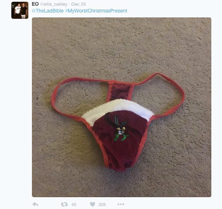 It’s always the thought that counts, but sometimes the thought could’ve been reconsidered. This festive “garment” is part velvet, part mistletoe, and very uncomfortable-looking. The recipient must have been torn between laughing at the absurdity and wondering who decided to combine Santa and lingerie in such a bold way.