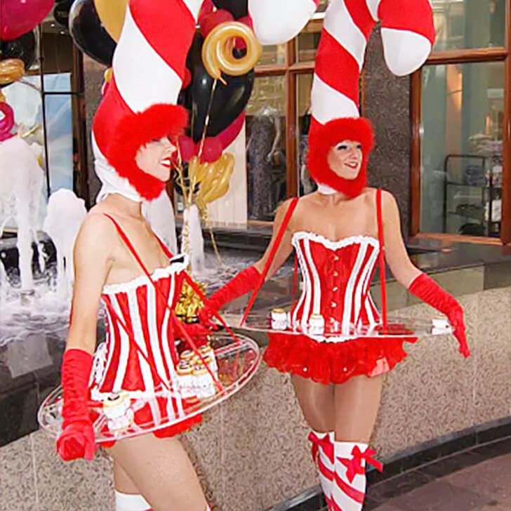 These two have taken “holiday spirit” to an entirely new level, stepping out dressed as human-sized candy canes with a side hustle in snack delivery. Between the striped corsets and towering hats that could double as festive traffic cones, they’re ready to serve looks—and maybe a few cupcakes—on a silver platter. Their dedication to bringing joy and desserts is as bold as their outfits.