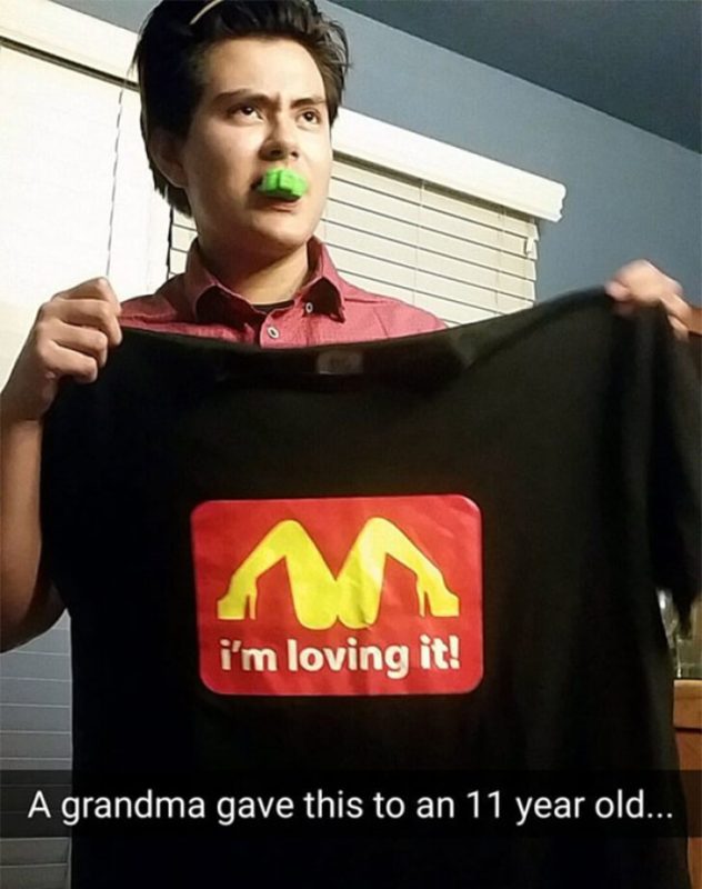 The mix of confusion and secondhand embarrassment makes this one for the family history books. You’ve got to love how Grandma probably picked it out, thinking she was being trendy, not realizing the not-so-subtle innuendo. It’s an innocent mistake—or at least, that’s what everyone hopes.