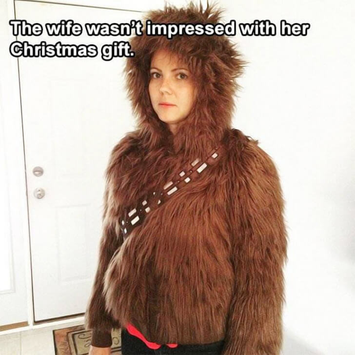 This might just be the ultimate test of love and patience. Gift someone a fur-covered jacket that makes them look like they belong in a galaxy far, far away, and you’ll either spark laughter or, as seen here, instant regret. The Chewbacca-inspired vibes are strong, but the expression on her face says she’s ready to return this straight to the “Star Wars” universe.