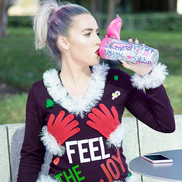 This sweater really brings a new meaning to “feeling festive.” With those strategically placed bright red gloves, it’s not just a bold fashion choice—it’s an interactive experience. Add in the tinsel details and pom-poms, and this is an outfit that practically demands attention, whether you’re sipping on water or trying to blend into a crowd. Spoiler: she’s not blending.