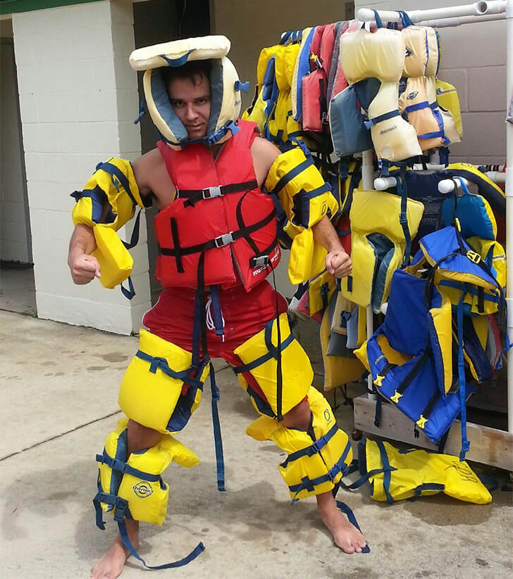 Okay, jetzt kommt etwas wirklich Außergewöhnliches: Dieser Typ hat sich in einen Haufen Schwimmwesten gehüllt. Das sieht erstmal ziemlich witzig aus, aber er nimmt das Thema Sicherheit auf dem Wasser scheinbar echt ernst. Schwimmwesten sind superwichtig, damit man immer oben bleibt und bei Schiffbruch nicht untergeht. Aber sie müssen richtig sitzen, um tatsächlich optimal zu funktionieren und Schutz zu gewährleisten.
