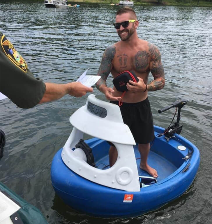 Dieses coole Foto zeigt einen Mann auf einem selbstgebastelten Jetski, der durch sein außergewöhnliches Fahrzeug scheinbar in eine brenzlige Situation mit einem Polizisten geraten ist. Doch es stellte sich heraus, dass alles in bester Ordnung ist. Der Polizist führte nur eine routinemäßige Überprüfung der Zulassung des Jetskis durch, ohne dass dabei ein Verstoß festgestellt wurde.