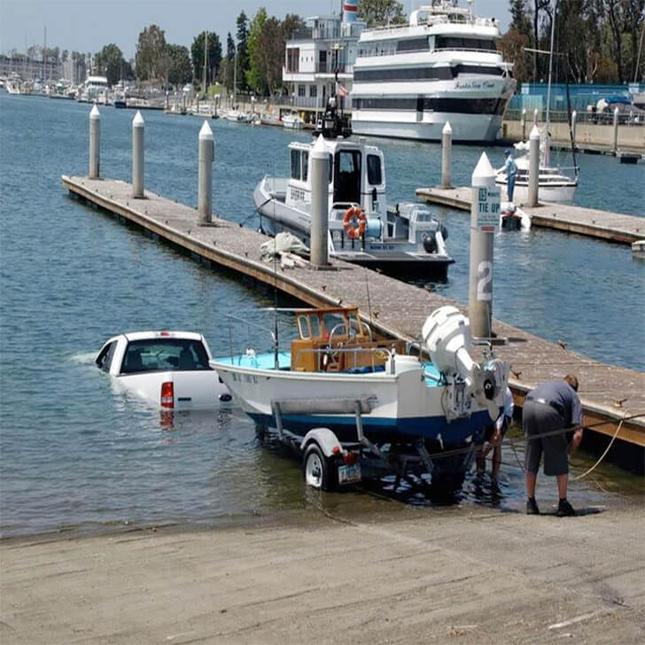 In diesem fast slapstickartigen Moment steht ein Mann neben einem Boot auf Rädern, während sein Auto im Wasser versunken ist. Die Situation könnte direkt aus einer Komödie stammen, aber für den Bootsbesitzer war das bittere Realität. Es scheint so, als hätte der Mann in der Aufregung sein Boot mit dem Auto verwechselt und schließlich einen Mechaniker zur Hilfe gerufen.